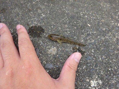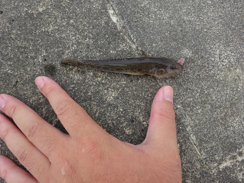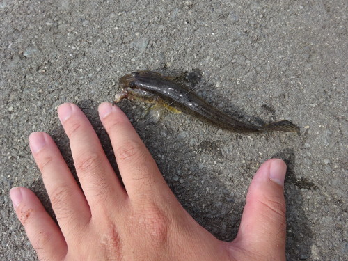 足元の深くなっているポイントでは反応がなかったため、ちょい投げで広く探るとすぐに釣れました。針はハゼ針5号です。