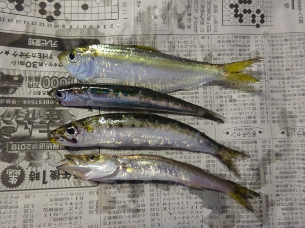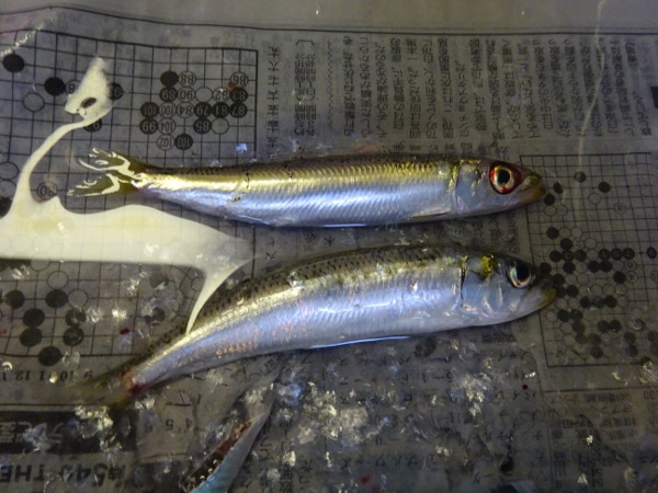 ウルメイワシも釣れました(上がウルメイワシ、下がマイワシです)。