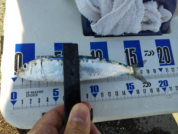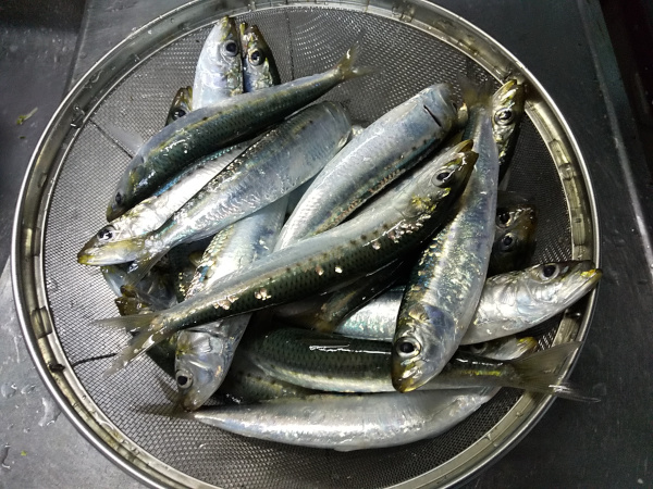 14時から2時間ほど釣りをして、18cmから19cmほどのマイワシが29匹釣れました。