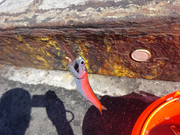 時折、底の少し上まで落としアジを狙いますが、2匹追加しただけでエサがなくなったため納竿しました。