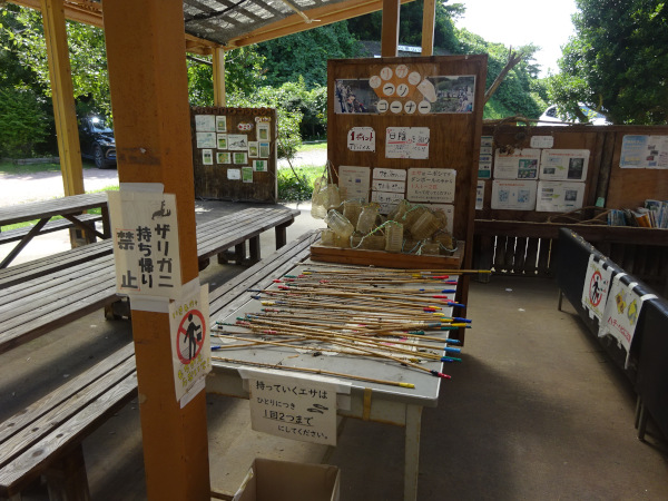 亀山里山公園「みちくさ」でのザリガニ釣り大会は、夏に毎年行われているイベントのようで、貸し竿とエサの煮干しは事務所で無料で借りることができます。