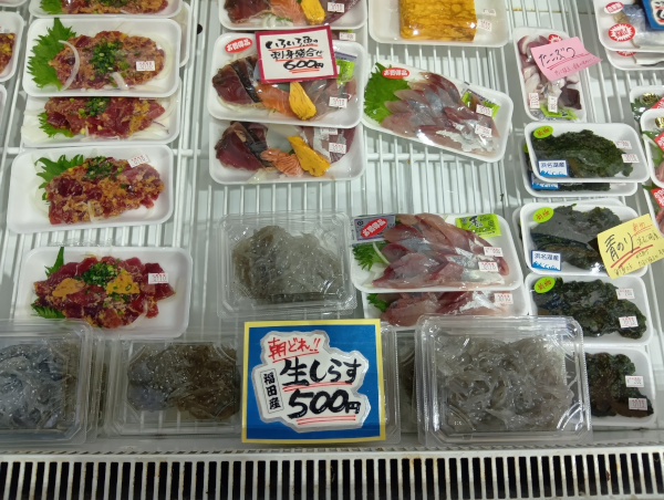 パックで売っている刺身を自分で丼に出来るのが嬉しいです!もちろん醤油やわさびも置いてます!